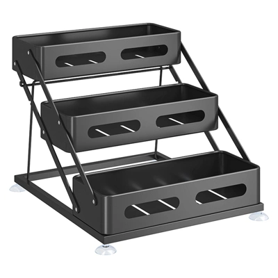 3-layer design organizer can hold kitchen spicesTriangular structure with suction cup at the bottom to keep the product stableRaise the guardrail to prevent bottles from fallingThe spice rack can be adjusted in height twiceRust-resistant and strong iron with high load-bearing capacityFunction: Foldable, multi-purpose Material: Iron Shelf classification: Countertop Style: Modern and simple