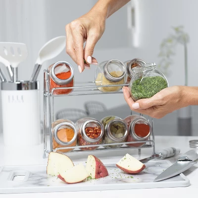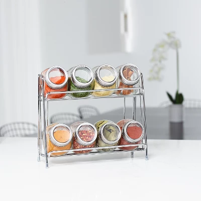 - 9-PIECE SET – Includes 8 glass spice jars with chrome covers and 1 space-saving 2-tier chrome rack for easy storage.