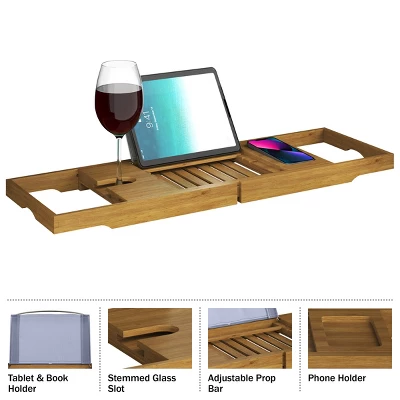 Unwind in the bath as this Bath Tub Tray Table by Home-Complete keeps your gadgets and favorite bathtub accessories close at hand. Designed to fit most bathtubs, this bathtub caddy extends from 27.25- to 44.75-inches, allowing the wooden tray to reach the edges of standard tubs and larger whirlpool baths alike. The natural acacia wood material has a vented design for quick drying, and the waterproof, cloth-covered back props your book or device at an ideal angle for comfortable viewing.