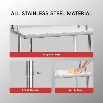 The Acekool stainless steel work table with overshelves is built for efficient food prep, storage, or general workspace needs in commercial and home settings.Its 18-gauge stainless steel construction provides resistance to rust and corrosion. Dual removable shelves expand storage options, and adjustable legs ensure stability on uneven floors.Measuring 30 inches wide by 24 inches deep with a 30 by 12-inch adjustable shelf, this table holds up to 1460 lbs and suits kitchens, workshops, offices, and more.