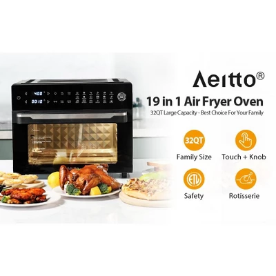 Meet Your New Kitchen MVP: The Aeitto 19-in-1 Air Fryer Oven!Crowded counters? Simplify your cooking with the powerful Aeitto® Air Fryer Oven Combo. This all-in-one powerhouse replaces SIX appliances, giving you back precious space without sacrificing any function.With a massive 32-quart capacity, it’s perfect for family dinners, meal prepping, or hosting friends. Whip up a 13-inch pizza, roast a 5-lb chicken, or toast breakfast for the whole crew—all at once. Its 360° rapid air technology ensures everything cooks faster and more evenly than a traditional oven, giving you crispy, golden results with little to no oil for healthier versions of your favorite fried foods.Get creative with 18+ built-in presets for air frying, baking, roasting, dehydrating, and even proofing dough. The easy digital control and included recipe book make it simple to go from box to kitchen hero in minutes.What’s in the box: Enamel Baking Pan, Air Fry Basket, Wire Rack, Rotisserie Spit & Fork, Drip Tray, and a Recipe Guide.