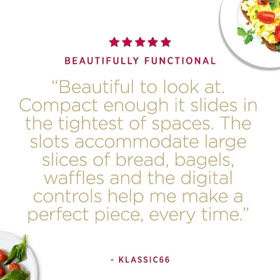 - 2 extra large slots: Has wide, self-centering slots that accommodate 2 slices of bread, bagels, or waffles of all thicknesses.