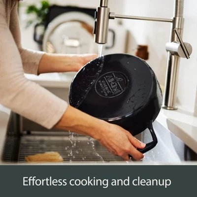 Built to Last-Cast Iron heats steady and evenly featuring a glossy enamel exterior combined with a black matte enamel interior that requires no pre-seasoning. The durable enameled interior and exterior while not nonstick is scratch and stain resistant