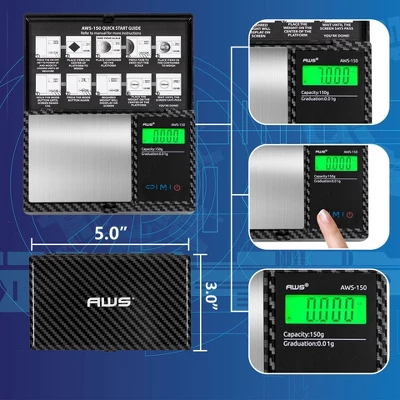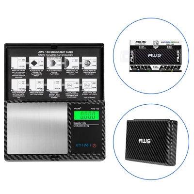 The āāSpecial Edition AWS-150-CF is designed in a trendy carbon fiber design. In new premium packaging with bonus, accessories make this the perfect portable pocket tool! For users seeking an on-the-go durable pocket scale for a variety of applications that include weighing food, coffee beans, dry herbs, gemstones, coins,āā and more. The flip-open lid protects the easy-to-clean stainless-steel weighing surface. Easy press buttons allow for āātaring as well as the ability to switch between color-changing weighing units of grams, ounces, grain, and carat. The backlit LCD screen makes it easy to read, even in low light conditions.