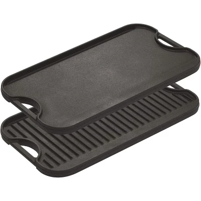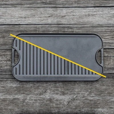 Whether you’re preparing a hearty breakfast feast for the whole family or grilling during a weekend camping trip, a large-capacity, multi-functional cookware can always make cooking twice as efficient. This cast iron double-burner reversible grill/griddle, with an extra-large size of 20″L × 10.5″W, covers two stovetops. Equipped with a reversible cooking surface, it easily handles diverse needs like searing, grilling, and pancake-making. Its non-toxic material and excellent heat conduction & retention capabilities balance deliciousness and health for both indoor and outdoor cooking, making it a “reliable partner” for kitchen and outdoor scenarios.Safe material is its core guarantee: Made of pure cast iron, it’s free from harmful chemicals such as PFAS, PFOA, and PTFE. It only forms an oil film surface through natural seasoning, so no toxic components are released during use. It’s safer to contact food, ensuring peace of mind for the elderly and children. Cast iron is hard and durable, resistant to deformation and wear. The oil film on the surface becomes denser with long-term use, making it more non-stick over time. Its service life far exceeds that of ordinary non-stick pans, and it can be called “heirloom cookware”—no frequent replacement is needed, offering great value for money.The reversible design unlocks diverse cooking options: One side is a grooved grill surface, suitable for searing steaks, grilling chicken, and roasting vegetables. The grooves lock in food juices and create attractive crispy grill marks, allowing you to replicate restaurant-level grilled flavors at home. The other side is a flat griddle surface, perfect for making pancakes, fried eggs, and breakfast sandwiches. It heats evenly without burning, easily achieving a golden and crispy texture. No need to change cookware repeatedly—one pan switches between “grilling mode” and “breakfast mode”, meeting diverse meal needs for daily family use and gatherings.Full-scene compatibility, adapting to various heat sources: It has excellent cooktop compatibility, working stably with all stove types (gas stoves, electric stoves, induction cookers), as well as ovens, outdoor grills, and even campfires—no need to worry about heat source incompatibility. Cast iron conducts heat evenly, ensuring consistent heat distribution after heating to avoid undercooking or burning due to local overheating. It also has excellent heat retention, keeping food warm after turning off the heat, which is practical for maintaining food temperature in winter and extending cooking time outdoors, making cooking more worry-free.Extra-large capacity + solid durability, suitable for multiple scenarios: With a size of 20″L × 10.5″W, it can cover two stovetops at once, frying 10-12 eggs, baking 5-6 pancakes, or grilling 3-4 steaks simultaneously. It easily meets the dining needs of a 5-8 person family or friend gatherings, eliminating the need for repeated batch cooking and saving a lot of time. The 0.81-inch thick pan body is solid and stable; though it weighs 13.5 pounds, its center of gravity is balanced, so it won’t shake easily when moving. The edges are smoothed to prevent food from spilling when pouring. Note that it has no coating and is not dishwasher-safe—clean it with warm water and avoid steel wool to protect the oil film; maintenance is simple.