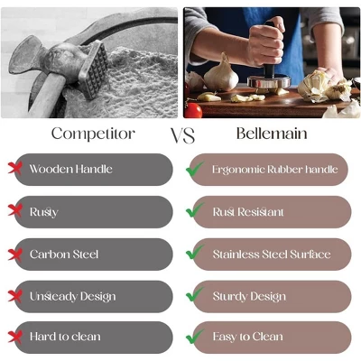 - MEAT POUNDER: Transform tougher cuts of meat into juicy, tender, flavorful steaks. The meat beater breaks down muscle fibers and protein molecules, resulting in softer, thinner steaks that cook faster and are easier to chew.