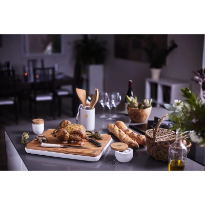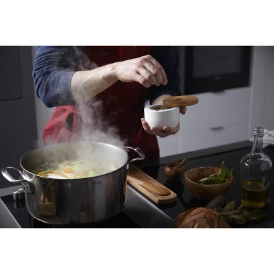 Discover the Berard Round Salt Keeper Millenari Gray—a perfect blend of function and style. Handcrafted from millennial olive wood, this salt keeper showcases the natural beauty of the wood grain. Its compact, round shape fits comfortably in your hand for easy seasoning. The stainless steel lid keeps your salt fresh and protected from moisture. Inside, a non-reactive glaze ensures flavor preservation. The versatile design accommodates different salt varieties. With its classic white color and organic grain patterns, it adds elegance to any kitchen or dining table. Crafted from reclaimed olive wood, it’s an eco-conscious choice. Elevate your cooking experience with this exceptional salt keeper.
