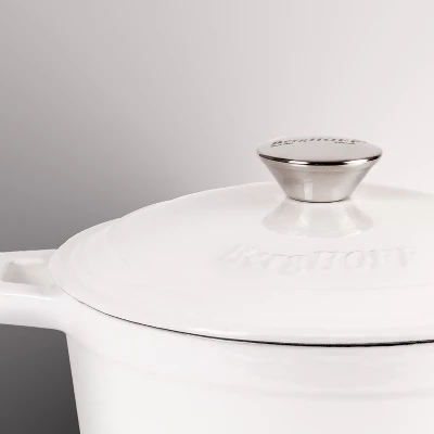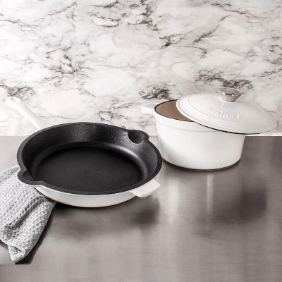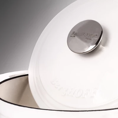 BergHOFF’s Neo Enameled Cast Iron is built to last for years to come. Crafted from durable cast iron with an enameled body this cookware heats up evenly and stays hot longer. The ergonomic handles provide a secure grip. Our meringue colored 3pc set includes one 10″ fry pan and one 3qt covered dutch oven. Cook like a pro with the versatile dutch oven that can go effortlessly from browning on the stove top to roasting in the oven. Braise short ribs, make hearty stew, three bean chili, curry chicken, and so much more. The beautiful cast iron fry pan with its sturdy handle is another multipurpose tool in your kitchen arsenal. Use the fry pan to make succulent lamb chops, crispy bacon, and even a delicious cake. Fry pan has an integrated pour spout which allows you to easily drain any unwanted fat from the pan. Our Neo cast iron cookware is suitable for all cooktops including gas, electric, ceramic, glass, and induction. Neo cast iron cookware is also oven ready. You can sear your food on the stovetop, and finish in the oven. Please allow cookware to cool completely before attempting to clean. Handwash recommended with warm water and mild detergent; dry thoroughly. Avoid cleansers that contain bleach or citrus extracts.
