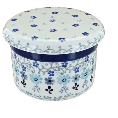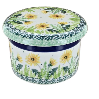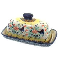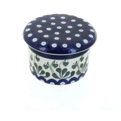 Handcrafted French butter dish keeps butter soft and fresh out on the counter for up to a month. Great for morning pastries or evening breads. Each piece is hand painted for an artisan finish. 4.5 wide x 3 inches tall. The Art of Polish Pottery, as we know it today, started as local folk art centuries ago in the German province of Silesia. The first known pieces of “Bunzlauer” stoneware dating back to the 16th century were crafted by hand and decorated with a folk art stamping technique using potatoes. Original designs were inspired by the peacock feather using the colors of cobalt blue, sage green and ferrous red. These designs and colors are still the inspiration for modern day patterns.Today, skilled Polish artists still individually handcraft and hand decorate each piece using small sponges to stamp each pattern and color. After the process of mixing ingredients, molding the pottery, applying the decorations and glaze, the pottery is twice fired. This process makes the pottery extremely durable, it will not crack or chip easily, and it is perfect for use in the microwave, dishwasher, oven and freezer. Along with our pottery, we have sourced a range of absolutely beautiful hand blown glassware from Poland. It is the perfect addition to your Polish Pottery Collection!