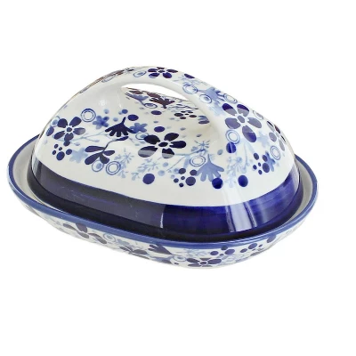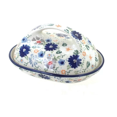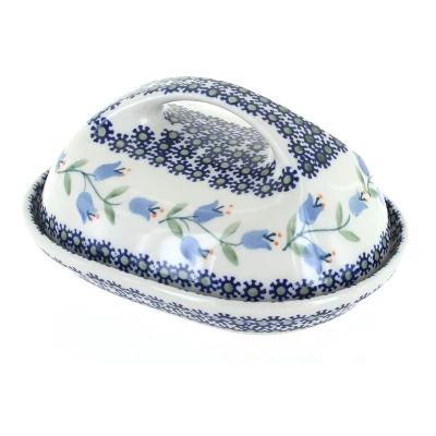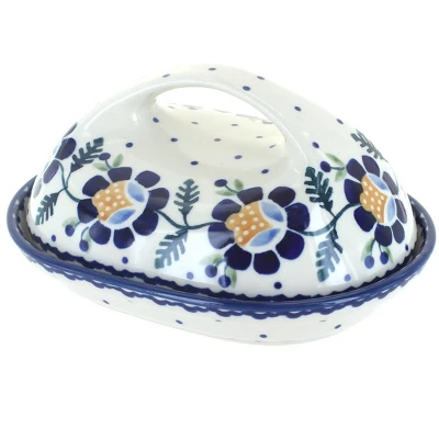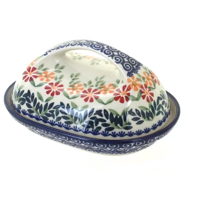 Covered dish with convenient handle keeps butter fresh for starting your morning or passing around the dinner table. Each piece is handcrafted and painted for an artisan finish. Dishwasher safe. 5 inches x 7 inches. Inside is 5 inches x 3.25 inches. The Art of Polish Pottery, as we know it today, started as local folk art centuries ago in the German province of Silesia. The first known pieces of “Bunzlauer” stoneware dating back to the 16th century were crafted by hand and decorated with a folk art stamping technique using potatoes. Original designs were inspired by the peacock feather using the colors of cobalt blue, sage green and ferrous red. These designs and colors are still the inspiration for modern day patterns.Today, skilled Polish artists still individually handcraft and hand decorate each piece using small sponges to stamp each pattern and color. After the process of mixing ingredients, molding the pottery, applying the decorations and glaze, the pottery is twice fired. This process makes the pottery extremely durable, it will not crack or chip easily, and it is perfect for use in the microwave, dishwasher, oven and freezer. Along with our pottery, we have sourced a range of absolutely beautiful hand blown glassware from Poland. It is the perfect addition to your Polish Pottery Collection!