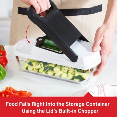 Use the Brentwood food chopper with storage container to chop all your favorite veggies quickly and with less mess! Just change out the included blade attachments to choose your chopping style and size. Container lid comes with a chopper compartment, just push veggies down with lid and they will cut and land right into the included storage container. Put together salsas, salads, and fresh snacks with this convenient mess free dicer!