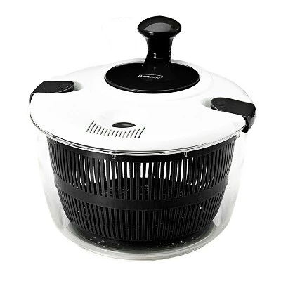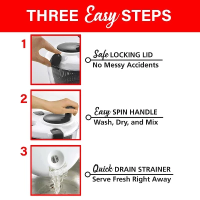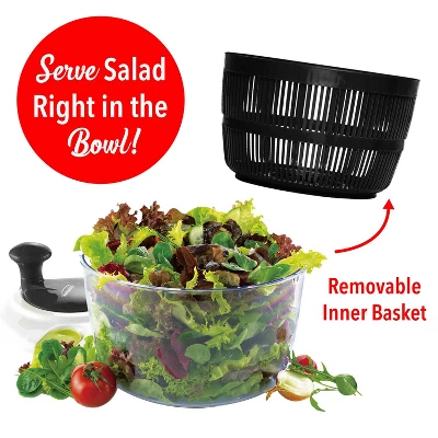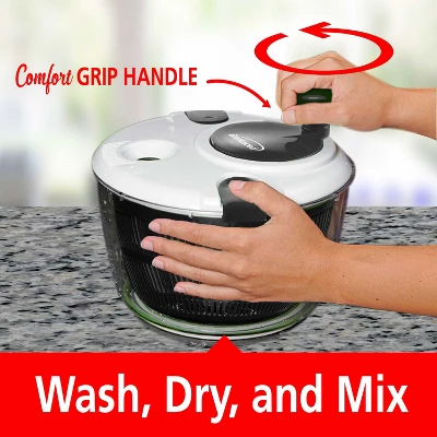 - Easy-to-use salad spinner has 5-qt. serving bowl and mess-free locking lid