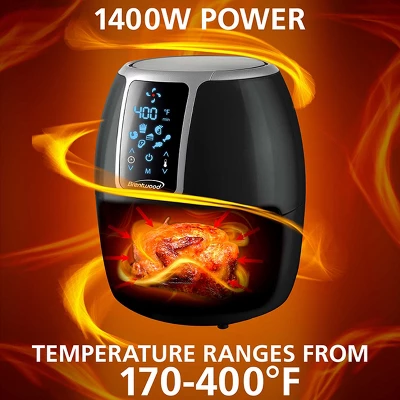 Use the powerful 1400 watt Brentwood 4-Quart Small Electric Air Fryer to fry foods to perfection quickly and evenly without the guilt of extra fat and calories. Our air fryer requires little to no oil to beautifully cook French fries, onion rings, chicken wings, steak, roasted veggies and more. Use the quick reference temperature guide and the 30 minute timer with auto shut off for fast, crispy results. Easily adjust the temperature between 170°F to 400°F. Cool touch, removable fry basket make serving easy. The frying pan and basket is made with a non-stick surface for effortless clean up.