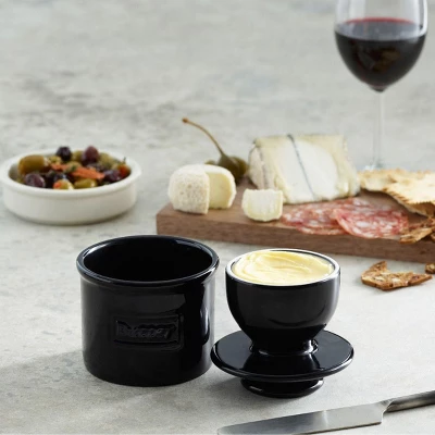 Add sleek sophistication to your kitchen with the Café Retro Midnight Black Butter Bell® Crock. Designed with raised butter and beurre lettering, this glossy ceramic crock blends café-inspired style with modern elegance. Using the traditional French water-seal method, it keeps butter soft, fresh, and ready to spread without refrigeration.Simply press softened butter into the lid, add cool water to the base, and enjoy perfectly spreadable butter for days. The glossy black finish and vintage-inspired design create a versatile accent for both contemporary and classic kitchens. Made from high-quality ceramic with a glazed interior, it holds one stick of butter and cleans easily in the dishwasher.With its bold color and vintage charm, this crock makes a delightful gift for home cooks, entertainers, and anyone who loves classic kitchenware.