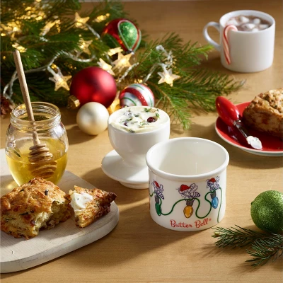Celebrate the holidays with the Farmhouse Honey Bee Christmas Butter Bell® Crock, a festive twist on one of our most popular designs. Featuring embossed honey bees surrounded by a cheerful holiday motif, this ceramic butter keeper combines seasonal charm with everyday function. Using the French water-seal method, it keeps butter soft, fresh, and perfectly spreadable without refrigeration.Pack the lid with one stick of softened butter, add cool water to the base, and enjoy perfectly fresh butter through the holiday season. With its limited-edition design, this crock makes a unique holiday gift for hosts, bakers, and bee enthusiasts alike.