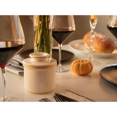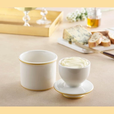 Add a touch of refinement to your kitchen with the Le Bistro White with Gold Trim Butter Bell® Crock. Featuring a smooth white finish accented by a thin gold rim, this ceramic butter keeper offers a sophisticated twist on French café style. Using the traditional water-seal method, it keeps butter soft, fresh, and perfectly spreadable without refrigeration.Simply press softened butter into the lid, add cool water to the base, and enjoy butter at the ready. The gold-trim detailing makes this crock a chic accent for both everyday dining and special occasions. Elegant and practical, it also makes a memorable gift for weddings, holidays, and anniversaries.