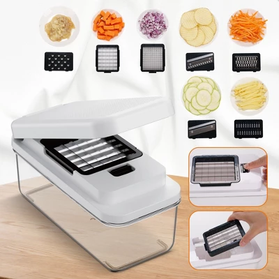 Make prep night faster and neater with the Cheer Collection Vegetable Slicer and Chopper, a complete all-in-one set that slices, dices, grates, and stores in one place. Built from BPA-free, premium ABS plastic with razor-sharp stainless steel blades, it delivers uniform, precise cuts that cook evenly and look chef-level on the plate. Swap among seven included blade options—shredder, wave cutter, coarse grater, fine grater, 2 mm slicer, 1/4″ cube, and 1/2″ cube—then drop ingredients straight into the large transparent container to keep counters clean. The snap-on lid converts the container into instant fridge storage, while the hand guard, non-slip base, and dicing press help protect fingers and keep every cut steady. A built-in strainer makes quick rinsing a breeze, and when you’re done, the parts disassemble for top-rack dishwasher cleaning. Finished in a sleek black-and-white two-tone, this compact system organizes neatly in the cabinet yet tackles everything from onions and potatoes to salad veggies, garnishes, and meal-prep staples.