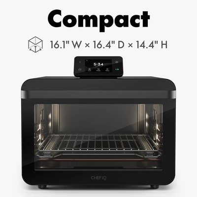 CHEF iQ has revolutionized the way you tackle cooking. The iQ MiniOven upgrades toaster ovens and cooks quickly, quietly, and efficiently. This powerful convection oven features functions including air fry, bake, broil, roast, air broil, toast, dehydrate, slow cook, reheat, proof, and keep warm, with a powerful temperature range that reaches up to 500°F. Featuring a built-in touchscreen control panel with haptic feedback and a speaker for audio alerts, you can manually program your cooking with ease. For wireless monitoring from any distance over Wifi, pair with the free CHEF iQ App; plus, you gain access to dozens of presets, how-to videos, and more! The MiniOven features indicator lights to guide rack placement, a soft-close door, and an edge-to-edge window with natural-tone interior lighting to accurately check doneness. Purchase includes a wire rack, broil pan/baking tray, dehydrator rack/air fryer basket, and glide rack, along with a removable crumb tray for easy cleanup. Purchase worry-free with a three-year limited warranty from CHEF iQ.