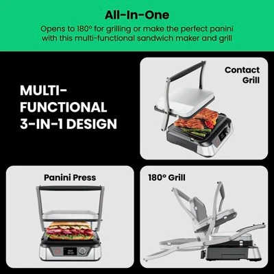 - MULTI-USE GRILLING OPTIONS: This 5-in-1 panini press doubles as a sandwich maker and opens flat 180° as an indoor electric grill. It comes with reversible grill grates, offering a smooth surface for sandwiches and pancakes or a BBQ grill surface for burgers.