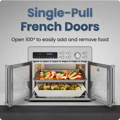 - SINGLE-PULL FRENCH DOORS: Opening the air fryer oven doors is easy. With just one pull, the French doors open 100 degrees to easily put food in or take out finished meals.