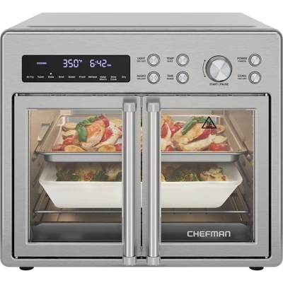 Cook delicious, extra-crispy meals for the whole family with the Chefman Toast-Air French Door Toaster Oven Air Fryer Combo! Featuring 10 versatile cooking functions including air fry, toast, bake, broil, roast, proof, reheat, keep warm, slow cook, and dry, this all-in-one machine will quickly become the most versatile appliance in your kitchen. This countertop oven comes equipped with a convection fan to evenly circulate air throughout the cooking chamber for the crispiest results possible, and the easy-to-open French doors make ample room to insert or remove food. With 26 quarts of cooking space available, the Toast-Air can fit up to a 12-inch frozen pizza or a 4-pound roast chicken! The easy-set dial makes programming your meals a breeze; just select your function, time, and temperature from 100°F to 450°F. The sleek stainless-steel finish holds up well to damage or stains, and this oven comes with a large air fryer basket, flat wire rack, bake/broil pan, and a removable crumb tray for easy cleanup. So skip the oven and roast off meals faster and crispier with the Toast-Air! UL approved with advanced safety technology for long-lasting durability and a 1-year assurance provided by Chefman. 1750W/120V—RJ50-FDAF-D25