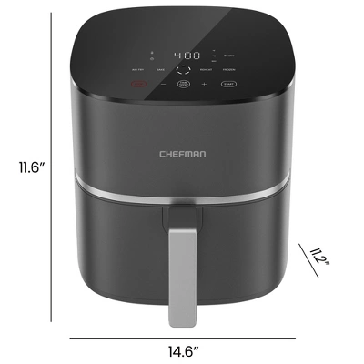 Enjoy all the deep-fried flavor without all the oil with the Chefman TurboX 5-Quart Digital Air Fryer. With convection cooking power, this compact airfryer can skip preheating and get right to crisping up French fries, chicken tenders, Brussels sprouts, and more! With the unique X-shaped basket, this appliance optimizes airflow to outpace traditional ovens with ease. Choose from four cooking functions including Air Fry, Bake, Reheat, and Frozen and customize the temperature up to 400°F using the digital touch control panel. Automatic shake reminders will sound off halfway through cooking to alert you when to shake your food. The 5-quart basket capacity ensures that you save counterspace while still being able to cook for up to 4 people. The PFAS-free basket is nonstick and top-rack dishwasher safe to make cleaning easy. Enjoy all the crisp with none of the guilt with Chefman air fryers. UL approved with advanced safety technology for long-lasting durability and a 1-year assurance provided by Chefman. 1500W/120V – RJ38-5T-GREY