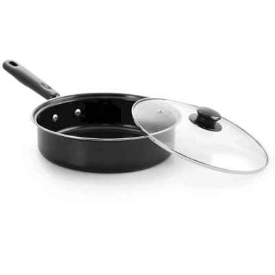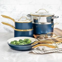 This Better Chef 7-piece carbon steel cookware set comes with heat-resistant tempered glass lids featuring steam holes for efficient cooking. The cookware also features heavy-duty handles for easy handling and durability. Both the interior and exterior of the cookware are coated with a non-stick finish, enhanced with Xylan non-stick coating for effortless cooking and cleaning. The set includes a 1-quart saucepan with a cover, a 2-quart saucepan with a cover, a 10-inch open skillet pan, and a 5-quart Dutch Oven with a cover.