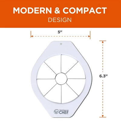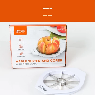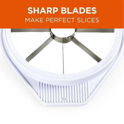 This handheld apple corer, slicer, and wedger saves time and reduces waste in busy home kitchens. Cut fruit into even slices, and core without the frustration. Reduce the prep time for making pies, salads, snacks, fruit desserts and platters – even home made baked potato wedges. Its easy to use and clean, requires no electricity, and takes up very little drawer or cabinet space.