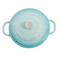 Create endless culinary possibilities with the Crock-Pot Artisan 5-Quart Enameled Cast Iron Dutch Oven with Lid in Aqua Blue. Designed as a versatile kitchen must-have, this Dutch oven boasts of durable cast iron construction that distributes and retains heat efficiently. It has a self-basting lid that redirects moisture back on the food for best results when sautéing, making stews, braising, and more. Compatible to use in the oven and on all cooktops, including induction stoves, it is a beautiful statement piece with wide handles to hold securely when serving from oven to table. Oven safe up to 500°F. Handwash recommended.