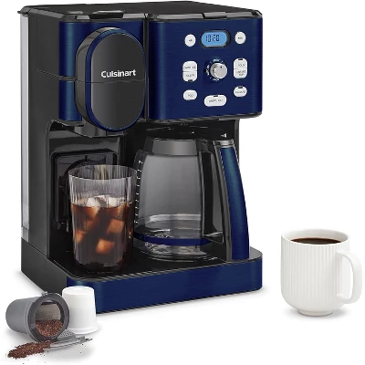 Drip or pod, hot or iced, single cup or carafe for 12—get your coffee, your way with the Cuisinart 2-in-1 Coffeemaker. This kitchen essential for coffee lovers takes home brewing to another level by combining 12-cup carafe and single-serve options in one convenient unit. Brew a full pot 25% faster with Extreme Brew technology. Customize when and how you want your coffee with advanced start, Brew Pause™, temperature control, auto-off, and bold flavor settings. Instantly brew a single serving of hot coffee in 5 cup sizes with any pod, including Keurig K-Cup®, or the reusable HomeBarista™ filter. Or brew over ice for delicious coffee that refreshes! Experience complete brewing versatility and customizable convenience, courtesy of Cuisinart!Product Features:- Drip Coffee: 12-cup glass carafe- Extreme Brew® feature uses re-engineered brewing technology to deliver coffee up to 25% faster- Fully automatic—24-hour brew start, auto off, self-clean, adjustable carafe temperature, ready tone alert- Over Ice- Brew Strength Control- Brew Pause™ feature- Gold tone, commercial-style, permanent filter- Charcoal Water Filter- Single Serve Brewer: Compatible with any brand of single-cup pod, including Keurig K-Cup® pods- 5 brewing sizes: 4oz, 6oz, 8oz, 10oz, 12oz Over Ice- 42 oz Removable Water Reservoir- Includes Cuisinart’s HomeBarista™ Reusable Filter Cup