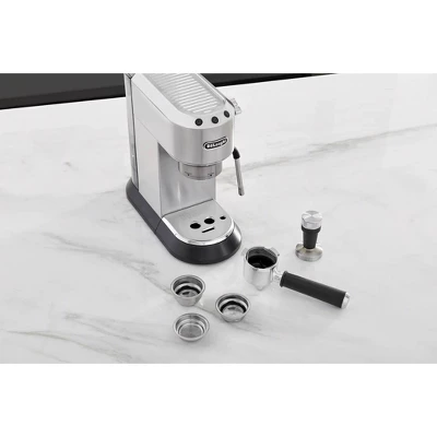 - Dedica Arte pump espresso machine, less than 6 inches wide, cup warmer, descaling alarm, premium cappuccino system.