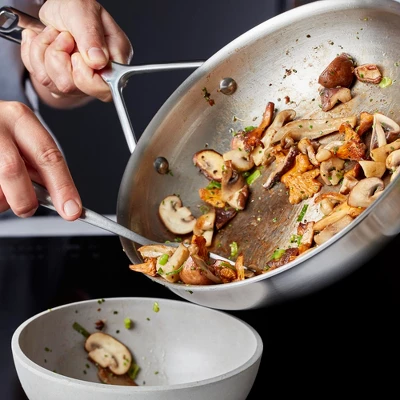 - 5-Ply construction ensures outstanding heat conduction and retention, flat base stability – pan won’t warp when heated
