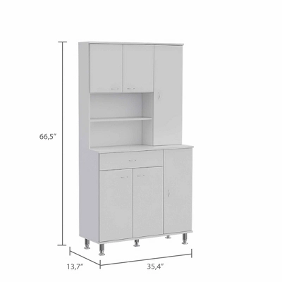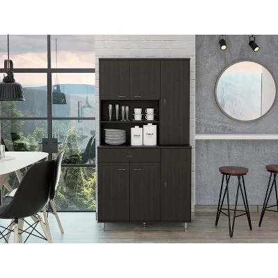 The Helis 90 Pantry Double Door Cabinet offers maximum storage with six door panels, ten shelves, and a large drawer. Ideal for dishes, pots, and utensils. Made of Black Wengue/White manufactured wood. Dimensions: Height: 66.5″, Width: 35.4″, Depth: 13.7″. Ready to assemble. CARB phase II compliant. 1-year warranty on wooden parts and hardware.