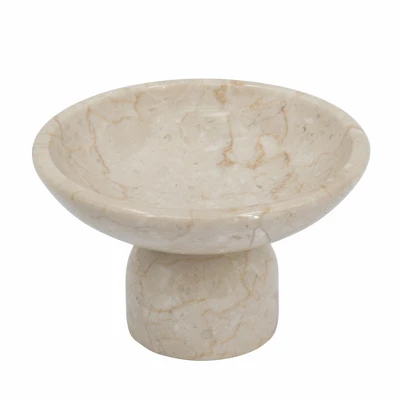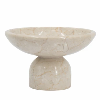 Organic modern style meets natural charm in this decorative accent bowl. Crafted from 100% premium marble and finished in an alluring cream hue, this piece boasts a smooth, spacious dish atop a round pedestal base. As versatile as it is eye-catching, this bowl could be used to display fruit, colorful decor pieces, or it could even thrive on its own as part of a creative ensemble.