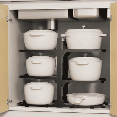 This 6-layer adjustable snap-on Pots and Pans Organizer Rack is suitable for storage under the cabinet. It is sturdy and made of thick carbon steel, with a load capacity of up to 100 pounds. Each layer can bear 15 pounds. Even the heaviest cookware can be easily stored, including cast iron pots, heavy frying pans, Dutch ovens, ceramic pots, etc. It is definitely a good helper for you to organize your cookware.