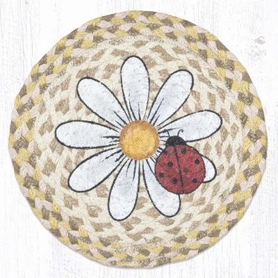 Bring a charming touch of the outdoors into your home with the Suzanne Pienta Daisy & Ladybug Round Jute Trivet. Measuring 10 inches in diameter and about 0.4 inches thick, this eco-conscious trivet is crafted from tightly braided, natural jute and features a hand-stenciled black daisy with a sweet red ladybug perched on one of its petals. The design evokes the warmth and freshness of springtime, making it a perfect addition to farmhouse, cottagecore, or nature-inspired décor. Use it as a decorative hot pad, centerpiece base, or seasonal table accent.