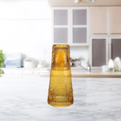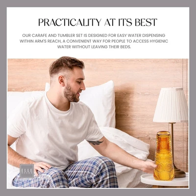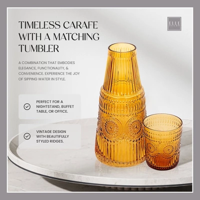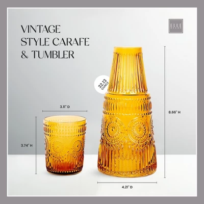 - Vintage Design: The Elle Dcor Bedside Water Carafe with Tumbler Set features an elegant and sophisticated vintage design, adding a touch of style to your nightstand or any living space. The matching tumbler doubles as a lid, keeping your water clean and refreshing