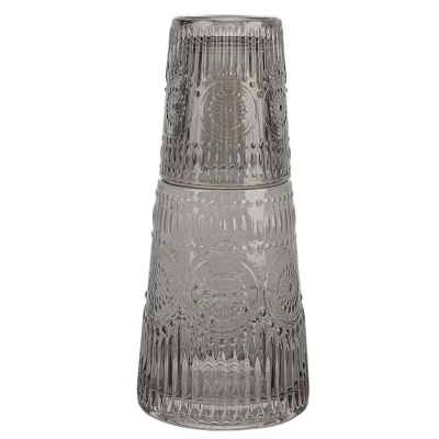 Introducing the Elle Décor Bedside Water Carafe with Tumbler Set, a perfect combination of vintage elegance and practicality. This 2-piece set includes a 33-ounce carafe and a matching tumbler that doubles as a lid. Crafted from durable, lead-free glass, this water decanter set ensures the longevity of your drinks and protects their flavors. Designed with an eye-catching vintage motif and beautifully styled ridges, this carafe and tumbler set adds a touch of sophistication to any living space. Whether it’s placed on your nightstand, buffet table, bar, or fireplace mantle, it seamlessly blends with your existing decor. Not only does this carafe set enhance the aesthetics of your home, but it also caters to your daily needs. Use it as a bedside water pitcher to keep yourself hydrated throughout the night, or store refreshing herbal iced tea and mouthwash. The versatility of this set makes it suitable for the guest room, office, or as a thoughtful gift. Cleaning is a breeze with this dishwasher-safe set, ensuring convenience and hassle-free maintenance. Measuring 4.21 inches in diameter and 8.66 inches in height, the carafe provides a generous capacity of 950 ml/32.13 oz, while the tumbler measures 3.11 inches in diameter and 3.74 inches in height with a capacity of 290 ml/9.81 oz.Impress your guests and loved ones with this exquisite Elle Décor Bedside Water Carafe with Tumbler Set. Whether it’s a wedding, housewarming, or any special occasion, this set is the perfect choice for those who appreciate the finer things in life. Elevate your drinking experience and add a splash of style to your surroundings with this timeless and functional carafe set.