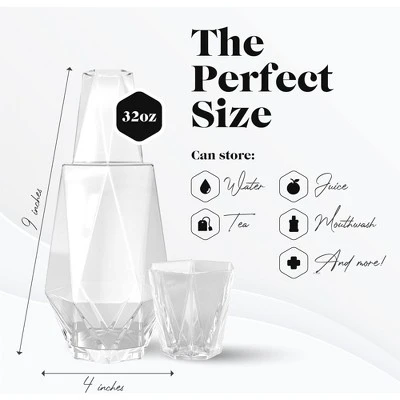 - Perfect Size. The carafe holds 37 oz and measures 4.5×4.5×9. In addition to using it to store bedside drinks of water, you can also use it to serve herbal iced tea or refreshing juice when eating meals. Adds a splash of style and elegance to your nightstand, buffet table, bar or fireplace mantle; coordinates beautifully with any existing decor