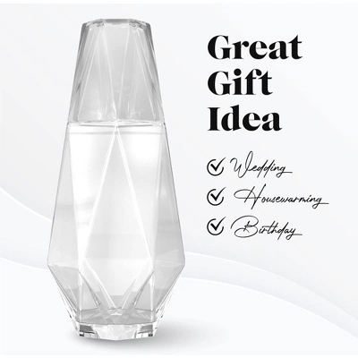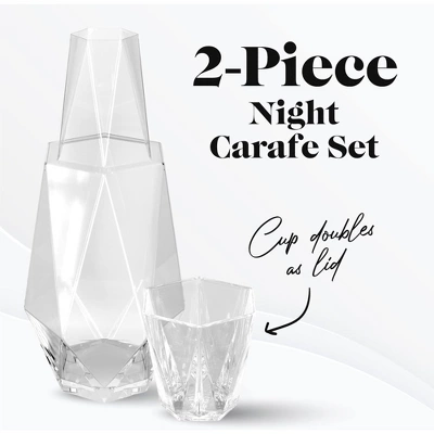 - 2-Piece Set. Geometric 2-Piece Night Carafe Set will make a great addition to your bedside table. Expertly crafted with lead-free glass, this set includes a clear carafe and silver tumbler that also serves as a lid to keep water clean for drinking and quenching thirst in the middle of the night.