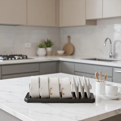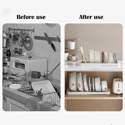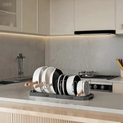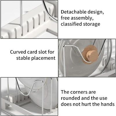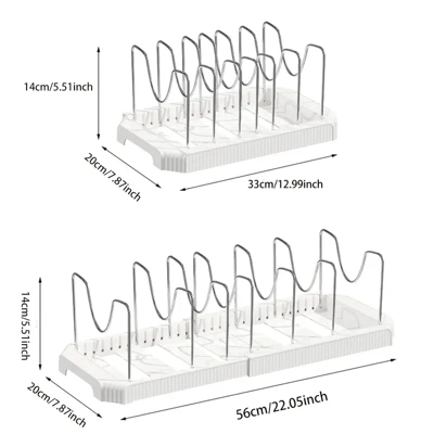 -Durable Each support frame is crafted from 304 stainless steel, providing excellent resistance to rust and corrosion. The U-shaped slot design with smooth edges ensures safe handling and makes it easy to store and access pot lids without scratching your cookware. The plastic base is lightweight, easy to clean, and prevents damage to pan surfaces.-Easy to Assemble & AdjustableSimply adjust the base to your desired length, insert a support frame into the connecting clips, and add additional frames as needed. Setup takes just minutes and requires no tools.-Practical & Cost-EffectiveWhile not made from premium luxury materials, this rack offers a highly functional and budget-friendly storage solution for keeping your kitchen organized.-Dimension: 12.99” x 7.87” x 5.51”