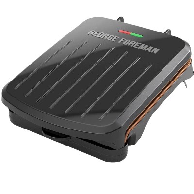 This compact grill just got even better for small kitchens! The George Foreman 2-Serving Classic Plate Electric Indoor Grill and Panini Press takes up 34% less space*, so you can store it in tight spots on the countertop or in the cupboard. Classic grill plates feature the Advanced George Tough nonstick coating that�s easy to clean, and is 3x more durable**. Plus, the adjustable cooking angle lets you tilt to remove excess fat during grilling, and set it flat for toasting panini. Top and bottom grill plates deliver fast grilling and delicious results for steak, burgers, chicken, veggies, and more! What will you make on your George Foreman Grill?