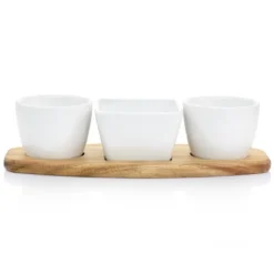 The Gibson Elite Gracious Dining 5 Piece Fine Ceramic Tidbit Dish Set with Acacia Wood Base is the perfect accent to any snack table for lavish get-togethers. Features four white ceramic dishes that fit within a rectangle Acacia wood base. Each ceramic piece includes built-in handles, providing an easy grip and visual appeal. Tidbit dishes are dishwasher safe and wood base must be wiped clean. Serve berries, spreads, nuts, or other tiny snacks and dips.