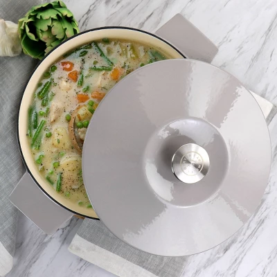 This medium 5 quart enameled cast iron dutch oven is the perfect combination of versatile and stylish. Constructed with durable cast iron that distributes and retains heat evenly, helping you to cook and bake your favorite dishes with the best result. Enameled surface is nonstick and easy to clean and the integrated handles let you move from stove to oven to table with ease. Beautiful and simple embossed stripe on outside adds an element of design. This pot is perfect for cooking, baking, reheating, and serving. Oven safe up to 500 Degrees Fahrenheit Use pot holders whenever moving or lifting hot cookware. Compatible on all cooking surfaces including the oven, broiler, and on the barbecue. Not dishwasher safe, do not use metal utensils. Hand wash only.