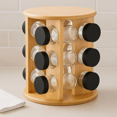 - Rotating Bamboo Rack: Designed with a smooth 360° rotating base, this spice organizer allows quick, effortless access to all 12 jars while saving valuable kitchen counter space.