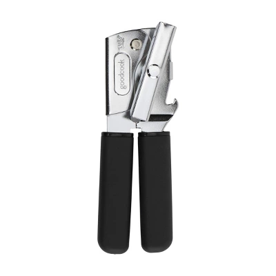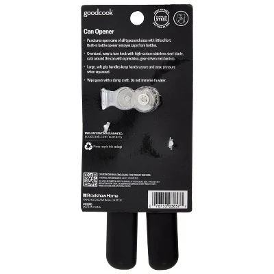Our GoodCook Ready Can Opener punctures open cans of all types, with little effort. Rotate the oversized turn knob to engage the high-carbon stainless steel blade that cuts around the can with a precision, gear-driven mechanism. Large, soft grip handles keep hands secure and reduce pressure when squeezed. There is a bottle opener integrated into the head of the can opener to remove bottle caps from beer, soda or sparkling water. Chrome plated finish on head is durable and won’t rust.