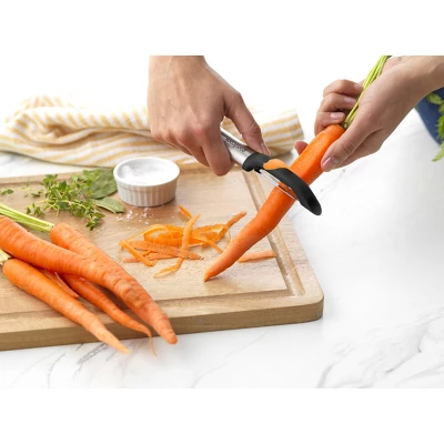 Our GoodCook Ready Swivel Peeler makes fast work of potatoes, apples, carrots, and more. The blade is made from durable stainless steel, and it swivels to adjust to the perfect cutting angle. It’s sharpened on both sides, so it’s great for right- or left-handed cooks, or it can peel both up and down. The integrated potato eye remover digs in to get rid of potato eyes or bruises on apples. With a stainless steel handle and a secure grip, this is comfortable to hold, and the protective blade cover keeps it safe in storage.