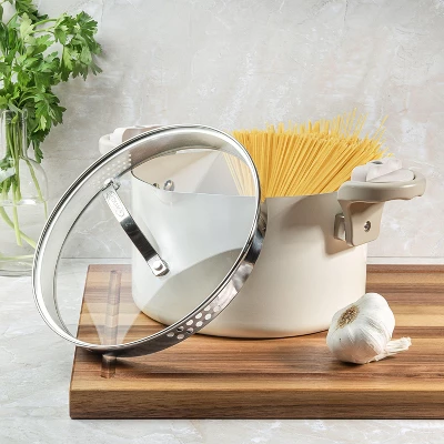 When it’s time to strain, it can be such a pain. You splash and spill your pasta everywhere. Not anymore. introducing the Gotham Steel nonstick pasta pot in the new Natural Collection. Gotham Steel pasta pot is the revolutionary, 5 qt. pasta pot complete with a lock-on lid that doubles as a smart strainer. The tempered glass lid has large holes on 1-side for draining larger foods like potatoes and ravioli and small holes on the other for smaller foods like spaghetti and vegetables. Just lift and lock and you’ll get a steady pour like never before. it’s that easy. plus, with the Gotham Steel copper-infused, scratch-resistant surface, you can boil and mash potatoes in the same pot. even cheesy chili mac is no match for the Gotham Steel pasta pot’s non-stick surface.