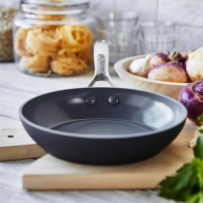 Featuring GreenPan’s signature healthy ceramic nonstick coating, the Paris Pro collection is twice as strong as stainless steel thanks to hard anodized aluminum bodies (plus it’s metal utensil safe). Made to last, it won’t warp, chip, or scratch and it’s free of PFAS, PFOA, lead, and cadmium, too. For searing, sautéing, and more this versatile 10” frypan is equipped with a riveted oven-proof stainless steel handle for a secure grip.