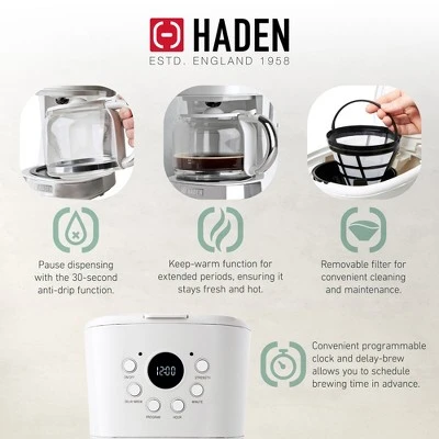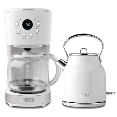 Upgrade your morning with the Haden Coffee Machine and Heritage Kettle. The sleek, durable housing is a hallmark of modern kitchen convenience and their simple beauty is a perfect addition to any countertop. Featuring a 12-cup capacity, this coffee maker is great for coffee lovers and enthusiasts. It nestles beautifully in spaces like offices, apartments, or college dorms and fits perfectly on your kitchen counter. The easy-to-use design includes a programmable clock and functions like Brew Strength for just the right type of brew to start your day, and a Delay Brew setting for coffee-making convenience on your schedule. Rely on the Auto Shut-Off feature that powers the unit off after 120 minutes (about 2 hours) for peace of mind on busy mornings. The water boiler is perfect for everything from boiling water for tea to craft coffee makers. Thanks to the 1.7-liter body, equivalent to 7 cups, you can heat up or boil up to 1.7 liters of water at a time. The electric kettle for boiling water is designed with a 360-degree base, too, which ensures it will be sturdy and not tip over and spill hot water. For added peace of mind, effortless pouring is guaranteed with the large handle, allowing you full control and a firm grip. Utilize the indicator light to know when the water in the electric pot is fully boiled. Additionally, the boil-dry cut-off protection adds an extra layer of safety to keep the stainless steel kettle from operating without water. If you forget to turn the tea kettle off, the auto shut-off feature will take care of that for you.Inspired by British homes, architecture, and landscapes, this Haden electric coffee maker and Heritage kettle feature a chic Ivory & Chrome color scheme.The Haden Coffee Maker and Heritage Kettle embody the fusion of innovation and modern functionality. Add these appliances to your kitchen necessities and take your morning to the next level.